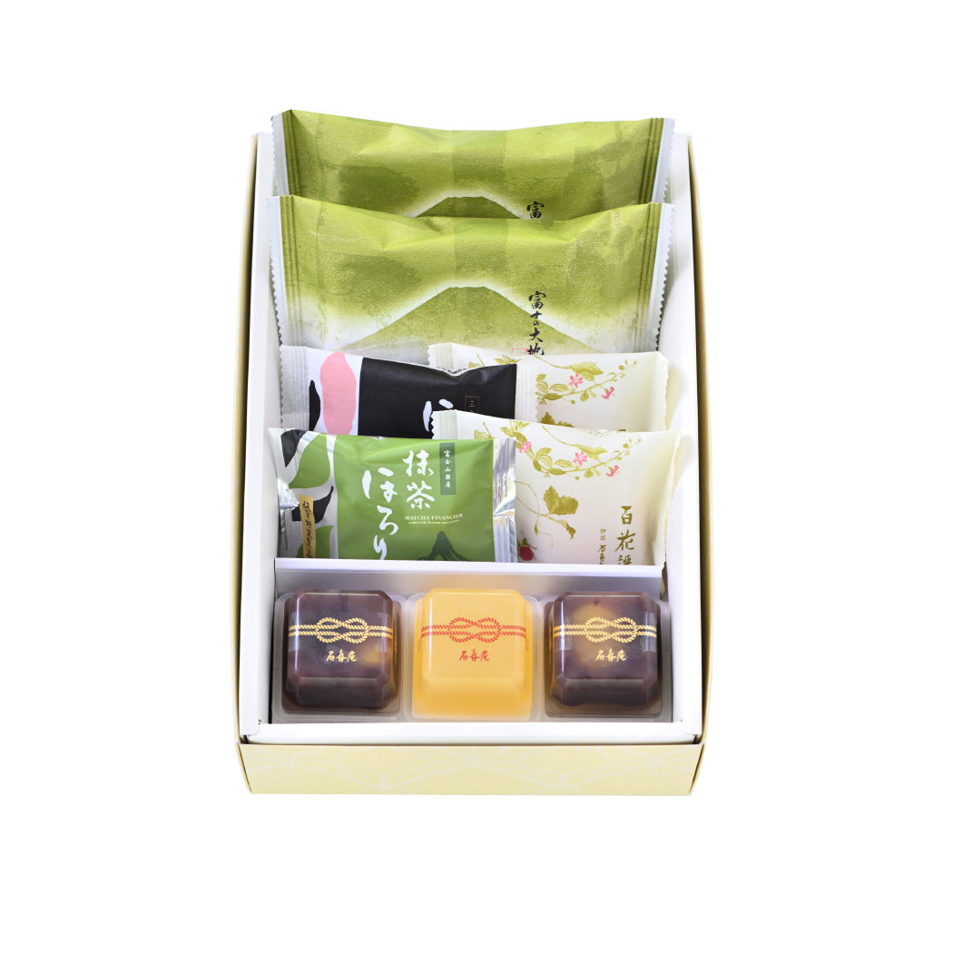 - 富士の大地 2個、ほろり 1個、抹茶ほろり 1個、百花譜 2個、すりりんごゼリー 1個、栗ぜんざい 2個