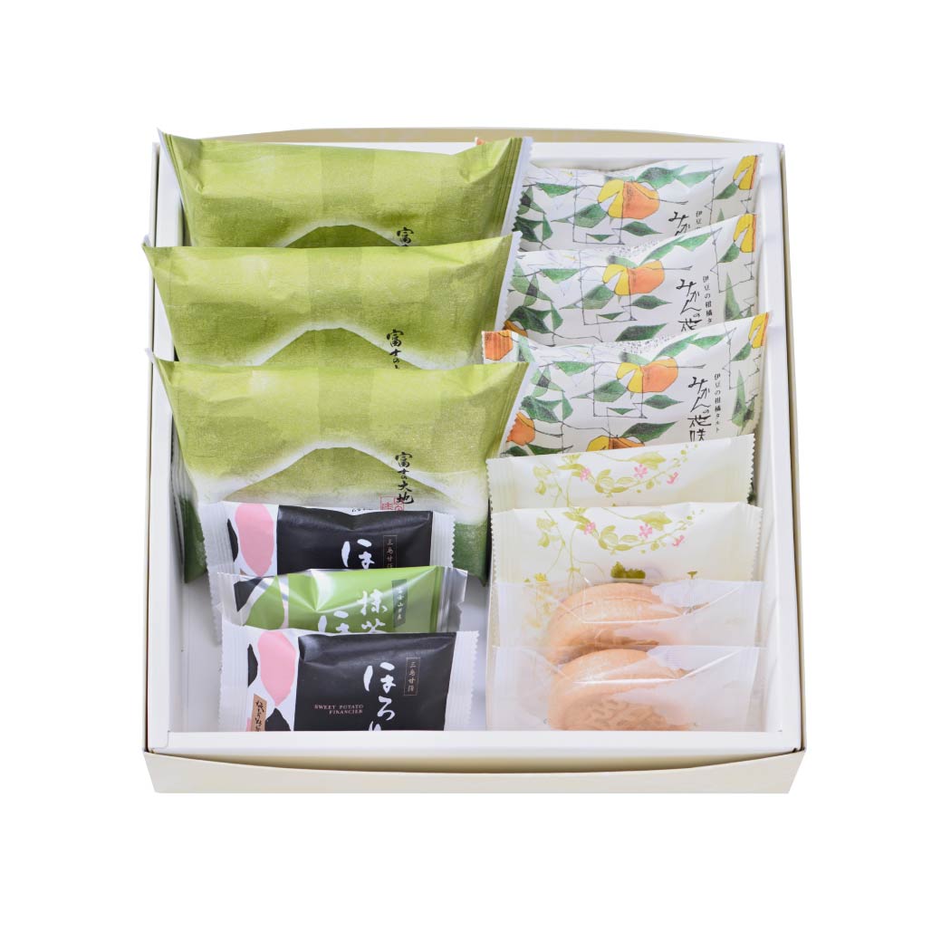 - みかんの花咲く丘 3個、富士の大地 3個、百花譜 2個、ほろり 2個、抹茶ほろり 1個、楽最中 2個
